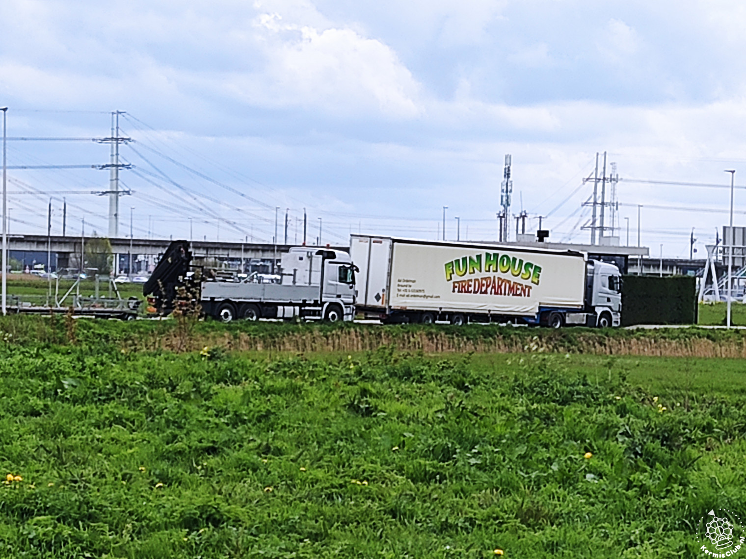 Joordi Op het parkeerterrein naast de A12 in Bleiswijk staan 2 transporten van het Fire department funhouse:
